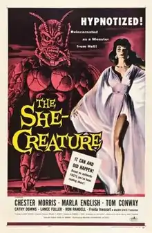 The She-Creature, or The She Creature, is a 1956 American black-and-white science fiction horror film, released by American International Pictures from a script by Lou Rusoff (brother-in-law of AIP executive Samuel Z. Arkoff). It was produced by Alex Gordon, directed by Edward L. Cahn, and stars Chester Morris, Marla English, and Tom Conway. The monster costume was created by master make-up artist Paul Blaisdell and is considered one of his best.[1]