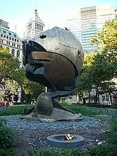 The Sphere (officially Sphere at Plaza Fountain)[2] is a 25-foot (7.6 m) high, cast bronze sculpture by German artist Fritz Koenig. It is located in Liberty Park at the World Trade Center in Lower Manhattan, New York City. Originally located at the Austin J. Tobin Plaza, the centerpiece survived the collapse of the World Trade Center towers, which resulted from the September 11 attacks in 2001.