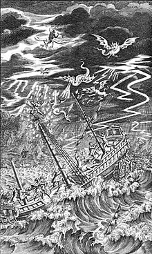William Strachey's A True Reportory of the Wracke and Redemption of Sir Thomas Gates, Knight, an eyewitness report of the real-life shipwreck of the Sea Venture in 1609 on the island of Bermuda while sailing toward Virginia, is considered a primary source for the opening scene, as well as a few other references in the play to conspiracies and retributions.[19] Although not published until 1625, Strachey's report, one of several describing the incident, is dated 15 July 1610, and it is thought that Shakespeare must have seen it in manuscript sometime during that year. E.K. Chambers identified the True Reportory as Shakespeare's "main authority" for The Tempest.[20] Regarding the influence of Strachey in the play, Kenneth Muir says that although "[t]here is little doubt that Shakespeare had read ... William Strachey's True Reportory" and other accounts, "[t]he extent of the verbal echoes of [the Bermuda] pamphlets has, I think, been exaggerated. There is hardly a shipwreck in history or fiction which does not mention splitting, in which the ship is not lightened of its cargo, in which the passengers do not give themselves up for lost, in which north winds are not sharp, and in which no one gets to shore by clinging to wreckage", and goes on to say that "Strachey's account of the shipwreck is blended with memories of Saint Paul's—in which too not a hair perished—and with Erasmus' colloquy."[21]