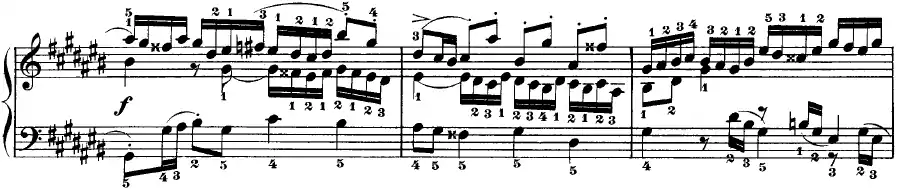 Such passages may instead be notated with the use of double-sharp or double-flat accidentals, as in this example from Johann Sebastian Bach's Well-Tempered Clavier, in G-sharp major (the overall key is C-sharp major):