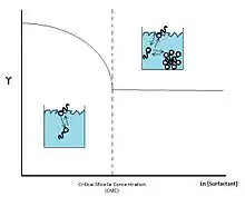 The critical micelle concentration (CMC) is the exact concentration of surfactants at which aggregates become thermodynamically soluble in an aqueous solution. Below the CMC there is not a high enough density of surfactant to spontaneously precipitate into a distinct phase.[7] Above the CMC, the solubility of the surfactant within the aqueous solution has been exceeded. The energy required to keep the surfactant in solution no longer is the lowest energy state. To decrease free energy of the system the surfactant is precipitated out. CMC is determined by establishing inflection points for pre-determined surface tension of surfactants in solution. Plotting the inflection point against the surfactant concentration will provide insight into the critical micelle concentration by showing stabilization of phases.[7]