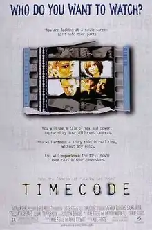 Timecode is a 2000 American experimental film written and directed by Mike Figgis and featuring a large ensemble cast, including Salma Hayek, Stellan Skarsgård, Jeanne Tripplehorn, Suzy Nakamura, Kyle MacLachlan, Saffron Burrows, Holly Hunter, Julian Sands, Xander Berkeley, Leslie Mann and Mía Maestro.