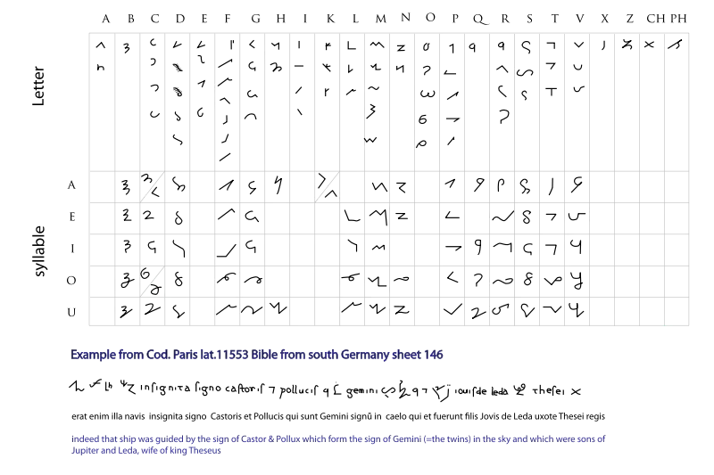 - Karl Eberhard Henke: Über Tironische Noten Manuscript B 16 of the Bibliothek der Monumenta Germaniae Historica, c. 1960 (German) (See 33. within for examples of composite Tironian notes.)