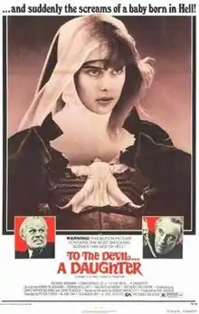 To the Devil...a Daughter is a 1976 British-West German horror film directed by Peter Sykes, produced by Hammer Film Productions and Terra Filmkunst, and starring Richard Widmark, Christopher Lee, Honor Blackman, Nastassja Kinski and Denholm Elliott. It is based on the 1953 novel of the same title by Dennis Wheatley. It was the final Hammer production to feature Christopher Lee until The Resident in 2011. On home videocassette the film was released with the alternate title Child of Satan.[2]