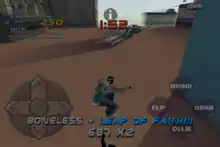 In Tony Hawk's Pro Skater 2, the player character is self-propelling and can have their course altered via the arrow keys or d-pad. The player character is capable of jumping and change direction midair. The game features a vast number of skateboarding tricks.[6] One button can be used to switch footedness between "regular" or "goofy", while another can initiate a nollie or a fakie. Passing from a nollie to a fakie (or vice versa) in a chain of tricks increases the multiplier factor of the score collected for that chain. Other button inputs can be used to perform slides, grabs, and flips. A series of inputs can be used to perform lip tricks. It is possible to perform wall rides and transfers (changing ramps) as well as manuals that allow several tricks to be chained together.[5] The player must use directional input to maintain balance during a manual; in the 2X port, balance is visually represented by a vertical scale that appears next to the player character.[7]