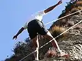 Climber being lowered by the belayer, with weight on the top rope and hands outstretched for balance while "walking" down.