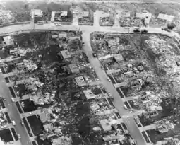 The tornado first struck residential areas, cleanly sweeping away entire rows of homes and hurling vehicles hundreds of yards through the air. Grass was scoured from the ground as well, according to eyewitnesses.[9] Washburn University took a direct hit from the tornado, and many of the large stone buildings on campus were badly damaged or destroyed.[9] A 300-pound section of stone wall was torn from one building and thrown two miles away.[10] One vehicle on campus was reportedly lofted and thrown over the top of the university's ROTC building, before coming to rest on the 50-yard line of the football field.[11] The tornado went on to rip through the central part of the city, hitting the downtown area. Buses were crushed as the transportation barn was collapsed by the tornado and the trains on the Santa Fe Railway were overturned. Most of the downtown buildings were badly damaged or had their windows blown out. Cars were flipped and tossed, and streets were blocked with debris. Many workers at the AT&T building downtown took shelter after a co-worker notified people of the approaching tornado, which they could not hear through the soundproof operating room. The building was hit, but only light damage occurred. The Kansas State Capitol building also experienced minor damage.