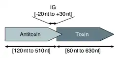 A toxin-antitoxin system is a set of two or more closely linked genes that together encode both a "toxin" protein and a corresponding "antitoxin". Toxin-antitoxin systems are widely distributed in prokaryotes, and organisms often have them in multiple copies.[2][3] When these systems are contained on plasmids – transferable genetic elements – they ensure that only the daughter cells that inherit the plasmid survive after cell division. If the plasmid is absent in a daughter cell, the unstable antitoxin is degraded and the stable toxic protein kills the new cell; this is known as 'post-segregational killing' (PSK).[4][5]