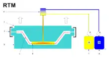 Resin transfer molding (RTM) uses a liquid thermoset resin to saturate a fiber preform placed in a closed mold. The process is versatile and can fabricate products with embedded objects such as foam cores or other components in addition to the fiber preform.[2]
