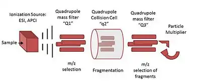 Both the first mass analyzer and the collision cell are continuously exposed to ions from the source, in a time independent manner.[4] It is once the ions move into the third mass analyzer that time dependence becomes a factor.[4] The first quadrupole mass filter, Q1, is the primary m/z selector after the sample leaves the ionization source. Any ions with mass-to-charge ratios other than the one selected for will not be allowed to infiltrate Q1. The collision cell, denoted as "q", is located between Q1 and Q3, is where fragmentation of the sample occurs in the presence of an inert gas like Ar, He, or N2. A characteristic daughter ion is produced as a result of the collisions of the inert gas with the analyte. Upon exiting the collision cell, the fragmented ions then travel onto the second quadrupole mass filter, Q3, where m/z selection can occur again.