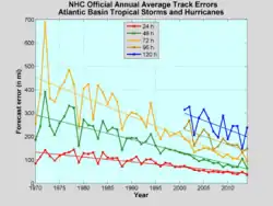 - National Hurricane Center. Annual average official track errors for Atlantic basin tropical cyclones for the period 1989–2005, with least-squares trend lines superimposed. Retrieved on 2006-11-30.