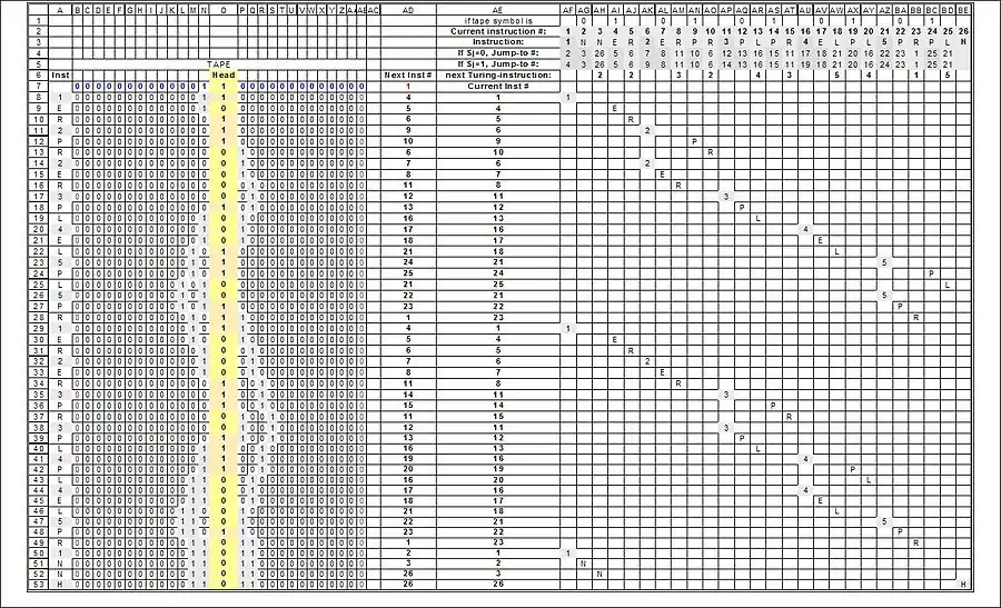 The full "run" of the 3-state busy beaver. The resulting Turing-states (what Turing called the "m-configurations" — "machine-configurations") are shown highlighted in grey in column A, and also under the machine's instructions (columns AF-AU)):