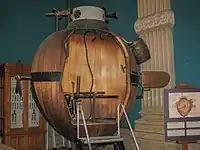 In making the hull, Bushnell enlisted the services of several skilled artisans, including his brother the farmer Ezra Bushnell and ship's carpenter Phineas Pratt, both, like David Bushnell, from Saybrook.[28] The hull was "constructed of oak, somewhat like a barrel and bound by heavy wrought-iron hoops."[29] The shape of the hull, Gale informed Silas Deane, "has the nearest resemblance to the two upper shells of a Tortoise joined together."[30]