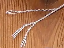 Twine is a strong thread, light string or cord composed of two or more thinner strands twisted, and then twisted together (plied). The strands are plied in the opposite direction to that of their twist, which adds torsional strength to the cord and keeps it from unravelling. This process is sometimes called reverse wrap.[1] The same technique used for making twine is also used to make thread, which is thinner, yarn, and rope, which is stronger and thicker, generally with three or more strands.