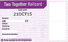 The Two Together Railcard is a scheme which gives discounts on certain types of railway ticket in Britain. Launched nationally in 2014 after a successful trial in 2011–12,[1] it was the first new Railcard scheme since the 1980s. It is available to any two named individuals aged 16 or over and is priced at £30.00 (as of 2020). There is no restriction on the number of times the Railcard can be used to purchase discounted tickets during the period of its validity, and there are no geographical restrictions on its use.[2]