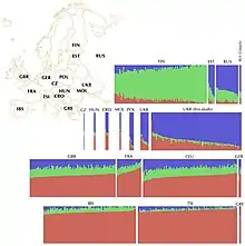 Roughly all R1a Ukrainians carry R1a-Z282; R1a-Z282 has been found significantly only in Eastern Europe.[99] Chernivtsi Oblast is the only region in Ukraine where Haplogroup I2a occurs more frequently than R1a, much less frequent even in Ivano-Frankivsk Oblast.[100] In comparison to their northern and eastern neighbors, Ukrainians have a similar percentage of Haplogroup R1a-Z280 (43%) in their population—compare Belarusians, Russians, and Lithuanians and (55%, 46%, and 42% respectively). Populations in Eastern Europe which have never been Slavic do as well. Ukrainians in Chernivtsi Oblast (near the Romanian border) have a higher percentage of I2a as opposed to R1a, which is typical of the Balkan region, but a smaller percentage than Russians of the N1c1 lineage found among Finnic, Baltic, and Siberian populations, and also less R1b than West Slavs.[101][102][103] In terms of haplogroup distribution, the genetic pattern of Ukrainians most closely resembles that of Belarusians. The presence of the N1c lineage is explained by a contribution of the assimilated Finno-Ugric tribes.[104]