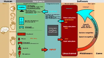 A human–machine interface usually involves peripheral hardware for the INPUT and for the OUTPUT. Often, there is an additional component implemented in software, like e.g. a graphical user interface.