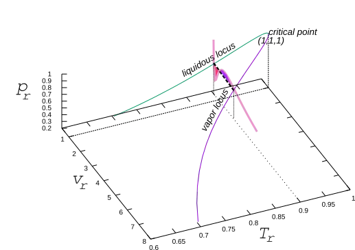 A pseudo-3D plot of the locus of liquid and vapor volumes versus temperature and pressure is shown in the accompanying figure. One sees that the two locii meet at the critical point (1,1,1) smoothly. An isotherm of the Van der Waals fluid taken at T r = 0.90 is also shown where the intersections of the isotherm with the loci illustrate the construct's requirement that the two areas (red and blue, shown) are equal.