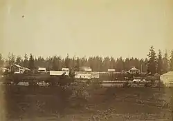 The Vancouver area was inhabited by a variety of Native American tribes, most recently the Chinook and Klickitat nations, with permanent settlements of timber longhouses.[21] The Chinookan and Klickitat names for the area were reportedly Skit-so-to-ho and Ala-si-kas, respectively, meaning "land of the mud-turtles."[22][23] First European contact was made by William Robert Broughton in 1792,[24][25] with approximately half of the indigenous population dead from smallpox before the Lewis and Clark Expedition camped in the area in 1806.[21] Within another fifty years, other actions and diseases such as measles, malaria and influenza had reduced the Chinookan population from an estimated 80,000 "to a few dozen refugees, landless, slaveless and swindled out of a treaty."[21]