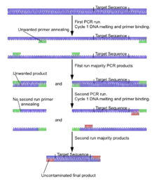 Nested PCR is used to increase the specificity of DNA amplification. Two sets of primers are used in two successive reactions. In the first PCR, one pair of primers is used to generate DNA products, which may contain products amplified from non-target areas. The products from the first PCR are then used as template in a second PCR, using one ('hemi-nesting') or two different primers whose binding sites are located (nested) within the first set, thus increasing specificity. Nested PCR is often more successful in specifically amplifying long DNA products than conventional PCR, but it requires more detailed knowledge of the sequence of the target.