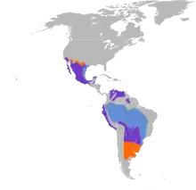 Their range includes almost all of Mexico, extending north into the southwestern United States, and south to scattered portions of Central America, and parts of northwestern and central South America. It has ranged as far north as Canada.[20] North American populations are generally resident, migrating only at the edge of the range. South American populations, especially those further south, may make long migrations to the northernmost parts of the Brazilian Amazon. This reflects a tendency to overwinter in areas where the temperature does not go below −1 °C (30 °F). Migrations may extend up to 4,000 km (2,500 mi). North American populations generally migrate by late August and return between February and April.[2] Their ability to migrate likely aided their wide colonization of the Americas.[8]