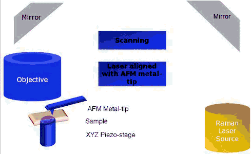The Raman/AFM technique has two approaches: aperture and apertureless, and the apertureless mode is realized with SERS and TERS. Figure 5 is the example of an integrated TERS system. It shows that there are five main components for a whole integrated TERS (apertureless) system. These components are: microscope, one objective lens, one integrated AFM head, a Raman spectrometer and a CCD. The laser is focused on the sample, on piezo-stage and the AFM tip by the moving the laser beam along the tip. The movement of the laser beam is achieved by the mirror in the top left corner. The XYZ piezo-stage in the left bottom holds the sample. In this design, the laser beam is focused on the sample through an objective lens, and the scattered light is collected by the same lens.