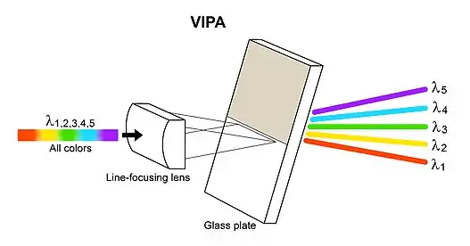 A virtually imaged phased array (VIPA) is an angular dispersive device that, like a prism or a diffraction grating, splits light into its spectral components. It works almost independently of polarization. In contrast to prisms or regular diffraction gratings, it has a much higher angular dispersion but has a smaller free spectral range. This aspect is similar to that of an Echelle grating which is usually used in reflection, since high diffraction orders are also used there. The VIPA can be a compact optical component with high wavelength resolving power.
