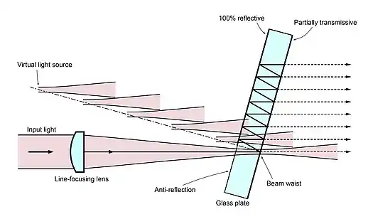 The main component of a VIPA is a glass plate whose normal is slightly tilted with respect to the input light. One side (light input side) of the glass plate is coated with a 100% reflective mirror and the other side (light output side) is coated with a highly reflective but partially transmissive mirror. The side with the 100% reflective mirror has an anti-reflection coated light entrance area, through which a light beam enters the glass plate. The input light is line-focused at the partially transmissive mirror on the light output side. A typical line-focusing lens is a cylindrical lens, which is also part of the VIPA. The light beam is diverging after the beam waist located at the line-focused position.
