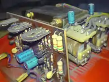 Generators, as used in power stations, ship electrical power production, or standby power systems, will have automatic voltage regulators (AVR) to stabilize their voltages as the load on the generators changes. The first AVRs for generators were electromechanical systems, but a modern AVR uses solid-state devices. An AVR is a feedback control system that measures the output voltage of the generator, compares that output to a set point, and generates an error signal that is used to adjust the excitation of the generator. As the excitation current in the field winding of the generator increases, its terminal voltage will increase. The AVR will control current by using power electronic devices; generally a small part of the generator's output is used to provide current for the field winding. Where a generator is connected in parallel with other sources such as an electrical transmission grid, changing the excitation has more of an effect on the reactive power produced by the generator than on its terminal voltage, which is mostly set by the connected power system. Where multiple generators are connected in parallel, the AVR system will have circuits to ensure all generators operate at the same power factor.[1] AVRs on grid-connected power station generators may have additional control features to help stabilize the electrical grid against upsets due to sudden load loss or faults.