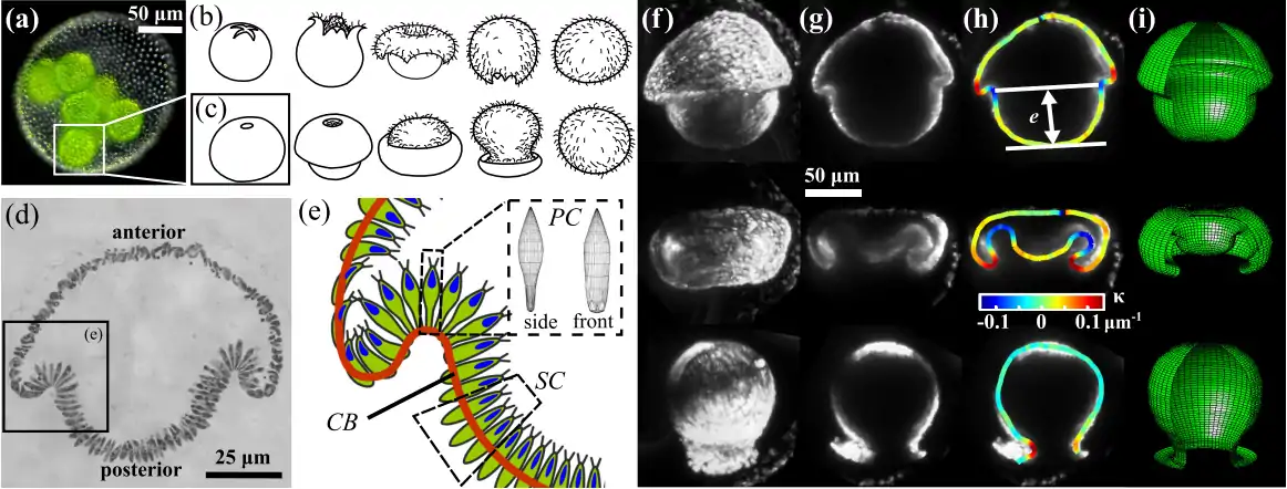 Colony inversion is a special characteristic during development in the order Volvocaceae that results in new colonies having their flagella facing outwards. During this process the asexual reproductive cells (gonidia) first undergo successive cell divisions to form a concave-to-cup-shaped embryo or plakea composed of a single cell layer. Immediately after, the cell layer is inside out compared with the adult configuration—the apical ends of the embryo protoplasts from which flagella are formed, are oriented toward the interior of the plakea. Then the embryo undergoes inversion, during which the cell layer inverts to form a spheroidal daughter colony with the apical ends and flagella of daughter protoplasts positioned outside. This process enables appropriate locomotion of spheroidal colonies of the Volvocaceae. The mechanism of inversion has been investigated extensively at the cellular and molecular levels using the model species, Volvox carteri.[11]