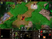 In addition, Warcraft III adds powerful new units called heroes.[11] For each enemy unit killed, a hero will gain experience points, which allow the hero to level-up to a maximum level of 10.[11] Progressing up a level increases the hero's attributes and also allows the hero to gain new spell options (bringing role-playing video game elements to the series).[5] Certain hero abilities can boost allied units.[5][3] All heroes can equip items to increase skills, defense, and other abilities.[4] At level six, the hero can obtain an "ultimate" skill that is more powerful than the three other spells that the hero possesses.[11] Heroes can also utilize the various natural resources found throughout the map, such as controllable non-player characters, and markets in which the hero can purchase usable items.[11] Often, hero units become the deciding factor in determining a winner.[5]