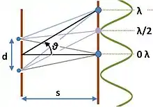 When sinusoidal waveforms add, they may reinforce each other (constructive interference) or cancel each other (destructive interference) depending upon their relative phase. This phenomenon is used in the interferometer. A simple example is an experiment due to Young where light is passed through two slits.[26] As shown in the figure, light is passed through two slits and shines on a screen. The path of the light to a position on the screen is different for the two slits, and depends upon the angle θ the path makes with the screen. If we suppose the screen is far enough from the slits (that is, s is large compared to the slit separation d) then the paths are nearly parallel, and the path difference is simply d sin θ. Accordingly, the condition for constructive interference is:[27]
