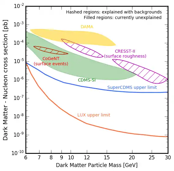 There are currently no confirmed detections of dark matter from direct detection experiments, with the strongest exclusion limits coming from the LUX and SuperCDMS experiments, as shown in figure 2. With 370 kilograms of xenon LUX is more sensitive than XENON or CDMS.[26] First results from October 2013 report that no signals were seen, appearing to refute results obtained from less sensitive instruments.[27] and this was confirmed after the final data run ended in May 2016.[28]