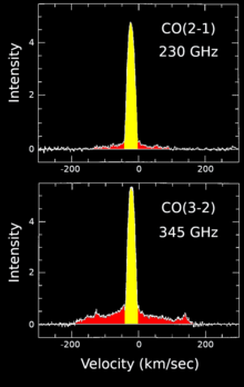 The dynamics of the molecular gas envelope can be studied by examining microwave emission-line spectra from carbon monoxide rotational transitions. These spectra show two distinct velocity components. The narrow cores of the spectral lines show the familiar parabolic profile of a slow (20 km/sec), high optical depth stellar wind from an Asymptotic Giant Branch (AGB) star. This material was expelled before the object became a protoplanetary nebula and constitutes the bulk of the nebula's mass. A second component arising from the far faster post-AGB wind is also visible. The fast (>190 km/sec) wind component becomes more prominent in higher frequency, higher energy spectral lines, because the fast wind has a higher temperature than the slow AGB wind.[4]