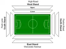 The outer White Hart Lane frame was designed in a rectangular shape, with the inner seating tiers being rounded to maximise the number of seats possible within the structure. The cockerel was placed upon the West Stand, with the West Stand located on Tottenham High Road, the East Stand being on Worcester Avenue, the North Stand on Paxton Road and the South Stand on Park Lane. The stands were officially named after compass points, but were more colloquially referred to by the road onto which they back.[61]