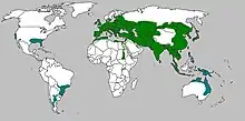 | Reconstructed range of wild boar (green) and introduced populations (blue): Not shown are smaller introduced populations in the Caribbean, New Zealand, sub-Saharan Africa, and elsewhere in Bermuda, North, Northeast, and Northwest Canada and Alaska.[1] | |