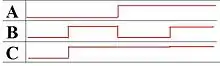 The output C is determined by the inputs at A and B according to the truth table (not shown) and square wave (below).