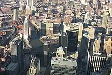 The origin of the name, Wolf Point, is unknown. In her 1856 memoir Wau-Bun, Juliette Kinzie states that 'the place was then called Wolf Point, from its having been the residence of an Indian named "Moa-way," or "the Wolf."'[1] Other alternate explanations are that it was so-named after the landlord of what would later be called the Wolf Point Tavern killed a ferocious wolf and hung a painted sign of a wolf outside his tavern to commemorate the event,[2] or that it was named by a soldier at Fort Dearborn because it was a place where wolves would gather at night.[3] Originally the term Wolf Point referred to the west bank of the Chicago River at the fork junction of its branches,[4][5][6] but it gradually came to refer to the whole region around the forks and in modern usage is often more specifically used to mean the plot of land on the north side of the forks.[6] The confluence of the three branches of the river near Wolf Point provided inspiration for Chicago's Municipal Device, a Y-shaped, city identification symbol that can be seen on many buildings in Chicago, and on city owned vehicles.[7][8]