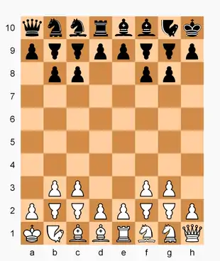 Wolf chess (German: Wolf-Schach) is a chess variant invented by Dr. Arno von Wilpert in 1943.[1][2] It is played on a 10×8 chessboard and employs several fairy pieces including wolf and fox – compound pieces popular in chess variants and known by different names.