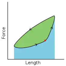 A work loop combines two separate plots: force vs. time and length vs. time. When force is plotted against length, a work loop plot is created: each point along the loop corresponds to a force and a length value at a unique point in time. As time progresses, the plotted points trace the shape of the work loop. The direction in which the work loop is traced through time is a critical feature of the work loop. As the muscle shortens while generating a tensile force (i.e. "pulling"), then, by convention in, the muscle is said to be performing positive work during that phase. As the muscle lengthens (while still generating a tensile force), the muscle is performing negative work (or, alternatively, that positive work is being performed on the muscle). Thus a muscle generating force while shortening is said to output 'positive work' (i.e. generating work), whereas a muscle generating force while lengthening produces 'negative work' (i.e. absorbing work). Over an entire cycle, there is typically some positive, and some negative work; if the overall cycle is counter-clockwise vs. clockwise work loop represents overall work generation vs. work absorption, respectively.[8] For example during a jump, the leg muscles generate work to increase the body's speed away from the ground, yielding counter-clockwise work loops. When landing, however, the same muscles absorb work to decrease the body's speed, yielding clockwise work loops. Furthermore, a muscle can produce positive work followed by negative work (or vice versa) within a shortening-lengthening cycle, causing a 'figure 8' work loop shape containing both clockwise and counter-clockwise segments.[9]