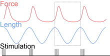 Hypothetically, a square work loop (area = max force x max displacement) would represent the maximum work output of a muscle operating within a given force and length range.[11][12] Conversely, a flat line (area = 0) would represent the minimum work output. For example, a muscle that generates force without changing length (isometric contraction) will show a vertical line 'work loop'. Reciprocally, a muscle that shortens without changing force (isotonic contraction) will show a horizontal line 'work loop'. Finally, a muscle can behave like a spring which extends linearly as a force is applied. This final case would yield a slanted straight line 'work loop' where the line slope is the spring stiffness.[13]