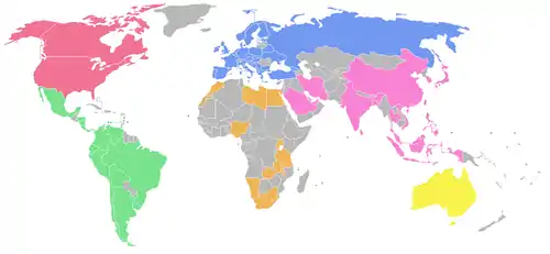 The WPA members are grouped by six continental/regional confederations, who in turn, consist of members from a country's national federation. The chart and table shows the WPA's members as of October 2017:[2]