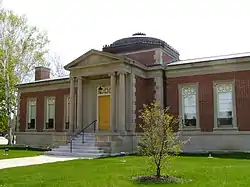 The Wright Building was donated to the Town of Duxbury by Georgianna Wright (1837–1919), an influential citizen of Duxbury and philanthropist. In 1890, Wright had donated her guest house to serve as the first Duxbury Free Library. The wooden building soon grew too cramped and by 1906, Wright decided to fund the construction of a new building. Sparing no expense, she hired a well-known architect, Joseph Everett Chandler, to design a brick library in the colonial revival style. Other projects by Chandler include the Frederic Adams Library in Kingston, Massachusetts and the restoration of the Paul Revere House in Boston, Massachusetts. The cornerstone was laid in 1907 and the building completed in 1909. A newspaper reporter present at the dedication noted some of the library's impressive features, including electric lighting and a reading room paneled in black cypress with gilded accents.[2]