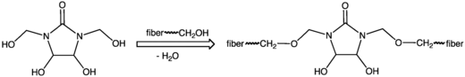 Dimethyloldihydroxyethyleneurea (DMDHEU) is the most commonly used durable-press finish. In this process, the chemical is first applied to the fabric. Then the fabric is heated to allow the chemicals to react with the cellulose molecules. In the reaction, the molecules of the fabric are bonded together to keep them from moving and causing wrinkles.[10][6] For this reason, durable-press treated garments behave as synthetics.[10] However, almost all the wrinkle resistant garments are made with poly/cotton blends fabrics.[16]