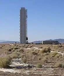 As part of Operation Tinderbox, on June 24, 1980, a small satellite prototype (DSCS III) was subjected to radioactivity from the "Huron King" shot in a vertical line-of-sight (VLOS) test undertaken in Area 3. This was a program to improve the database on nuclear hardening design techniques for defense satellites. The VLOS test configuration involved placing a nuclear device (less than 20 kilotons) at the bottom of a shaft. A communications satellite or other experiment was placed in a partially evacuated test chamber simulating a space environment. The test chamber was parked at ground level at the top of the shaft. At zero time, the radiation from the device shot up the vertical pipe to the surface test chamber. Mechanical closures then intercepted and sealed the pipe, preventing the explosive shock wave from damaging the targets. The test chamber was immediately disconnected by remote control from the pipe and quickly winched to safety before the ground could subside to form a crater. The Huron King test cost US$10.3 million in 1980 (equivalent to $32 million today).[18]