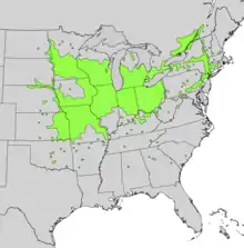 Rare in the South, it is more common in the northern United States.[3] In the United States, it occurs in Alabama, Arkansas, Connecticut, Delaware, the District of Columbia, Florida, Georgia, Iowa, Illinois, Indiana, Kansas, Kentucky, Louisiana, Massachusetts, Maryland, Maine, Michigan, Minnesota, Missouri, North Carolina, North Dakota, Nebraska, New Hampshire, New Jersey, New York, Ohio, Oklahoma, Pennsylvania, Rhode Island, South Carolina, South Dakota, Tennessee, Virginia, Vermont, Wisconsin and West Virginia; the species also occurs in Ontario and Quebec in Canada.[9] The species is listed as Endangered in Florida, Maryland, and New Hampshire; and as Special Concern in Tennessee.[9]