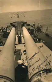 The Zara-class cruisers saw extensive service during World War II, having taken part in several sorties to catch British convoys in the Mediterranean as the flagship of the 1st Division.[11] At the Battle of Calabria in July 1940, torpedo bombers from the British aircraft carrier HMS Eagle attacked the Zara-class cruisers, but they failed to score any hits. The ships steamed ahead to the front of the Italian line of battle and joined the attack on the leading British battleship, Warspite, but they scored no hits. British cruisers attacked as the Italians withdrew, but heavy fire from the Italian cruisers drove them off.[12] All four ships escaped damage at the Battle of Taranto in November 1940.[11] In March 1941 at the Battle of Cape Matapan, Pola was immobilized by a torpedo from a Swordfish torpedo bomber launched by the British aircraft carrier HMS Formidable; Zara and Fiume were detached from the rest of the fleet to protect Pola, and all three and a pair of destroyers were sunk in a close-range night engagement with the battleships Barham, Valiant, and Warspite.[11] Italian casualties were very heavy, with 783 killed aboard Zara, 328 killed aboard Pola, 812 aboard Fiume.[13] The survivors, mostly from Pola, were rescued primarily by British destroyers, though Greek destroyers and an Italian hospital ship picked up others over the following few days.[14][15][16]