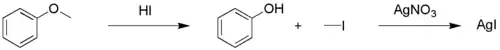 The Zeisel determination or Zeisel test is a chemical test for the presence of esters or ethers in a chemical substance.[1][2][3][4] It is named after the Czech chemist Simon Zeisel (1854–1933). In a qualitative test a sample is first reacted with a mixture of acetic acid and hydrogen iodide in a test tube. The ensuing reaction results in the cleavage of the ether or the ester into an alkyl iodide and respectively an alcohol or a carboxylic acid.