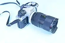 Zoom lenses are often described by the ratio of their longest to shortest focal lengths. For example, a zoom lens with focal lengths ranging from 100 mm to 400 mm may be described as a 4:1 or "4×" zoom. The term superzoom or hyperzoom is used to describe photographic zoom lenses with very large focal length factors, typically more than 5× and ranging up to 19× in SLR camera lenses and 22× in amateur digital cameras. This ratio can be as high as 300× in professional television camera lenses.[3] As of 2009, photographic zoom lenses beyond about 3× cannot generally produce imaging quality on par with prime lenses. Constant fast aperture zooms (usually f/2.8 or f/2.0) are typically restricted to this zoom range. Quality degradation is less perceptible when recording moving images at low resolution, which is why professional video and TV lenses are able to feature high zoom ratios. High zoom ratio TV lenses are complex, with dozens of optical elements, often weighing more than 25 kg (55 lb).[4] Digital photography can also accommodate algorithms that compensate for optical flaws, both within in-camera processors and post-production software.